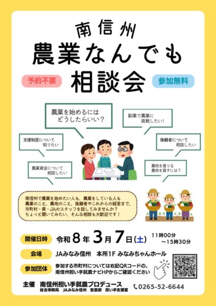 - 南信州担い手就農プロデュース 総合事務局:JAみなみ信州 営農部 担い手支援室